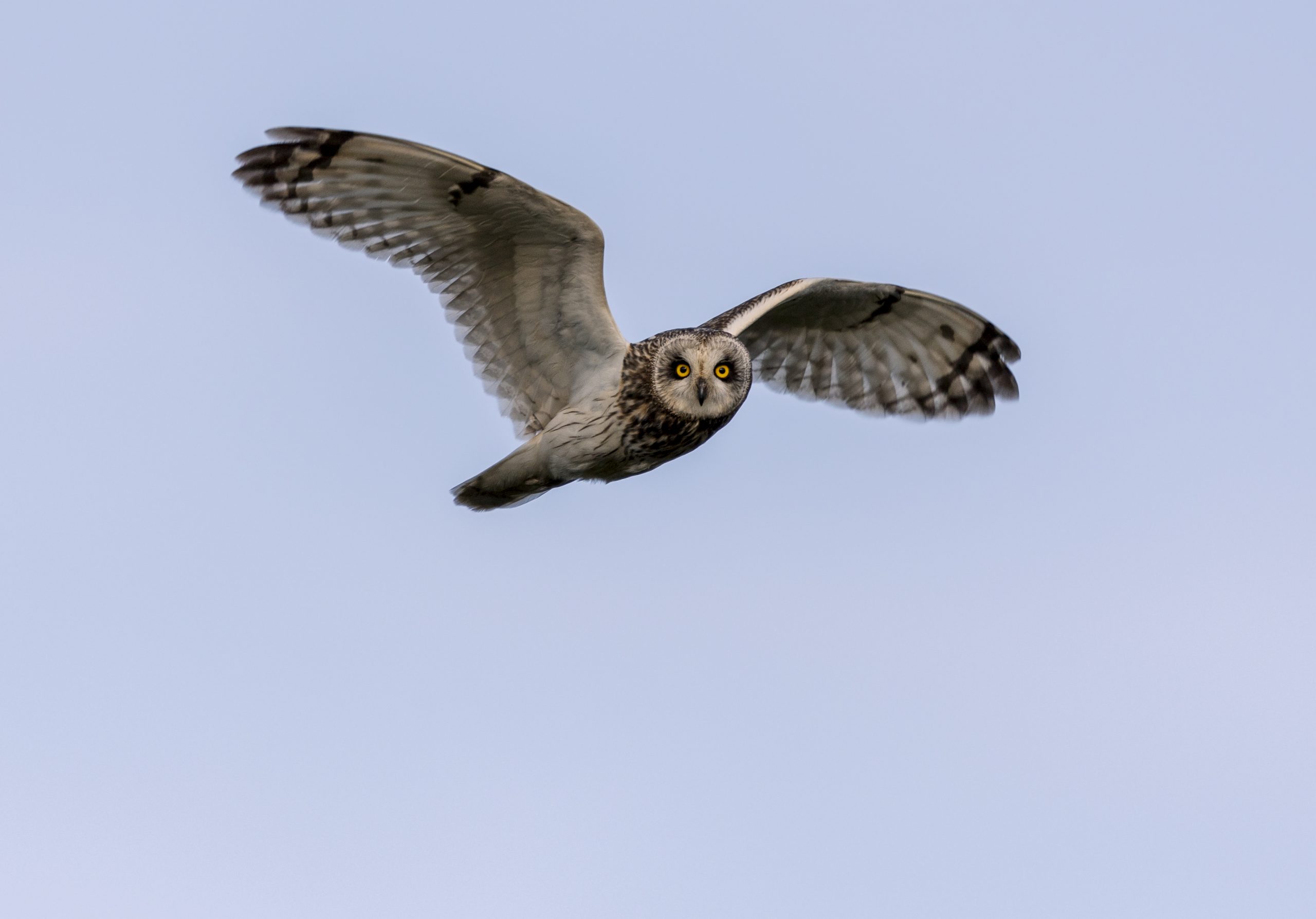 The short-eared owl is a medium-sized owl with a mottled, brown body, pale underwing and dark circles round its yellow eyes. It has a distinctive flight with the wings ‘pushed forward’ giving deep wing beats that are often described as rowing in slow motion. Its quartering flight involves a mixture of flapping, gliding and hovering, before dropping down onto an unsuspecting field vole.